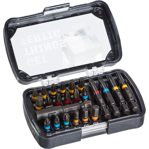 Kleiner praktischer Kasten mit Schnellwechselhalter für Akkuschrauber und den gängigen Bits.